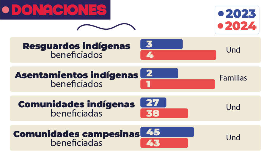 En 2024, realizamos 288 donaciones por un valor de COP 274 millones que beneficiaron a 38 comunidades indígenas, 43 comunidades campesinas, 4 resguardos indígenas y 1 asentamiento indígena.